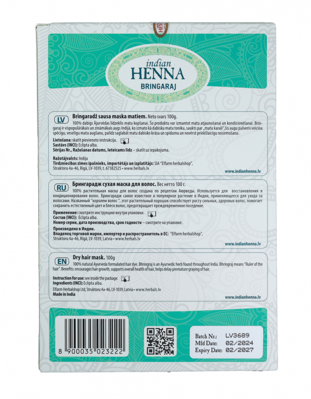 100% natural Ayurveda formulated hair dye. Bhringraj is an Ayurvedic herb found throughout India. Bhringraj means “Ruler of the hair”. Benefits: encourages hair growth, supports overall health of hair, helps delay premature graying of hair.