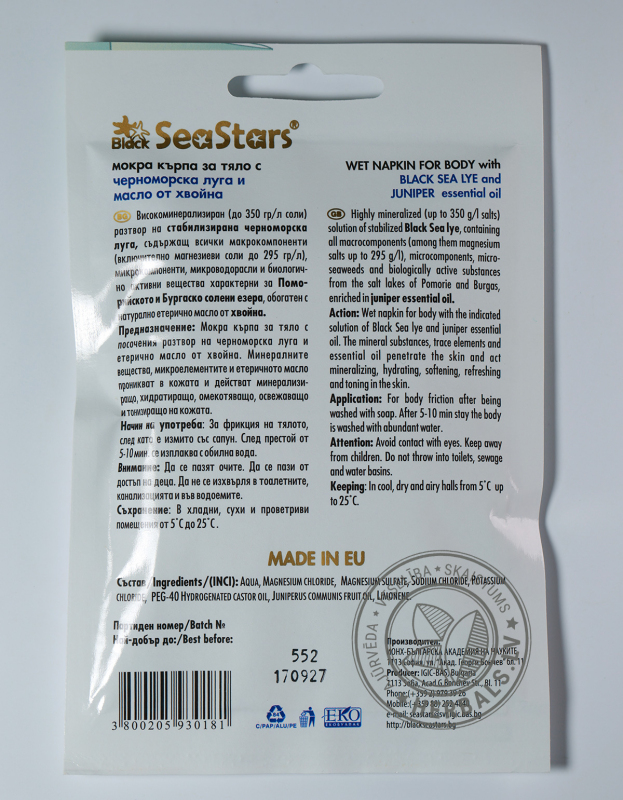 This salt compress wrap is impregnated with stabilized Black Sea lye — a highly mineralized natural solution enriched with juniper extract (Juniperus communis), traditionally valued for its cleansing, warming, and relaxing properties.