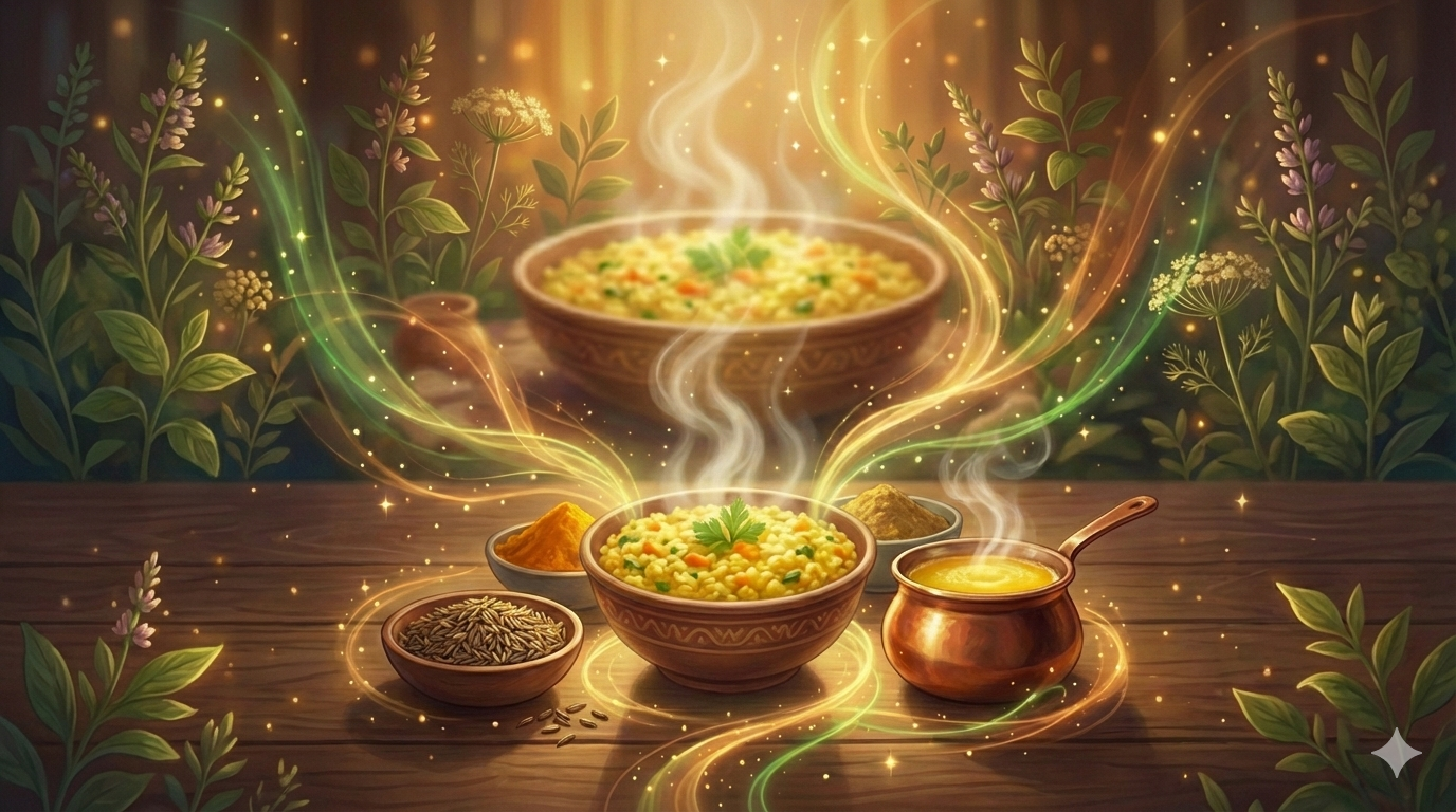 Kā gatavot: Uzkarsētā ghi sviestā izkarsējiet asafetīdu kopā ar kumīnu un kurkumu. Pievienojiet noskalotus rīsus un maš pupiņas, pārlejiet ar ūdeni un vāriet līdz mīkstai, krēmīgai tekstūrai. Šis ēdiens sasilda, atbalsta gremošanu un īpaši labi piemērots aukstām dienām, kad gribas vienkāršību un iekšēju mājīgumu.