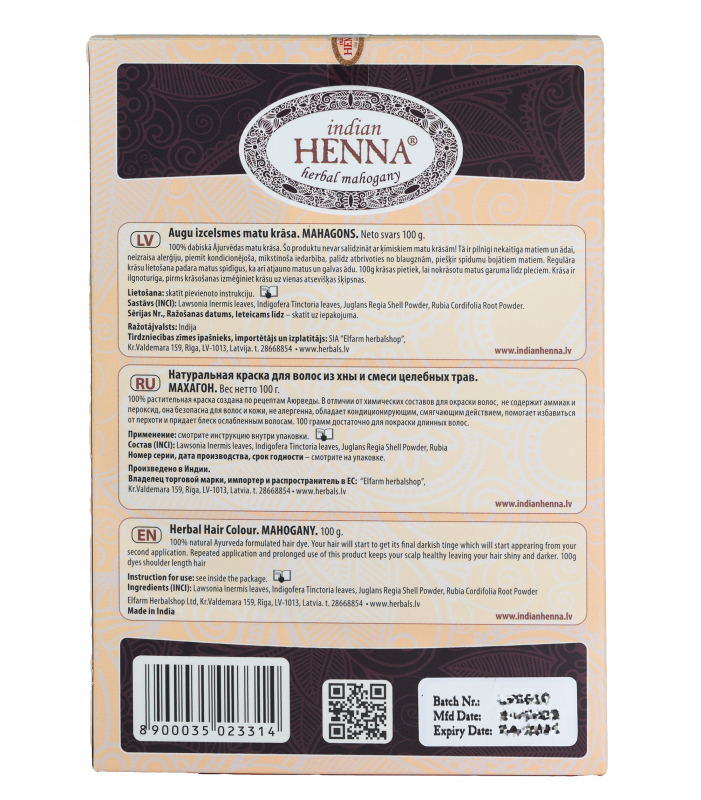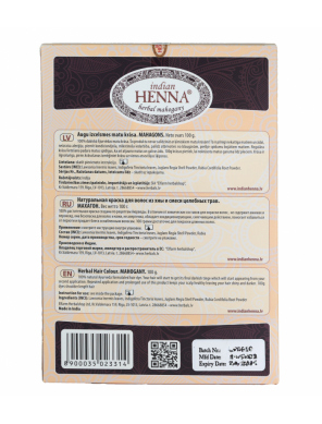 100% dabiskā Ājurvēdas matu krāsa. Šo produktu nevar salīdzināt ar ķīmiskajām matu krāsām! Tā ir pilnīgi nekaitīga matiem un ādai, neizraisa alerģiju, piemīt kondicionējoša, mīkstinoša iedarbība, palīdz atbrīvoties no blaugznām, piešķir spīdumu bojātiem matiem. Regulāra krāsas lietošana padara matus spīdīgus, ka arī atjauno matus un galvas ādu. 100g krāsas pietiek, lai nokrāsotu matus garumā līdz pleciem. Krāsa ir ilgnoturīga, pirms krāsošanas izmēģiniet krāsu uz vienas atsevišķas šķipsnas.
