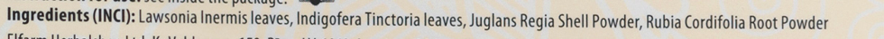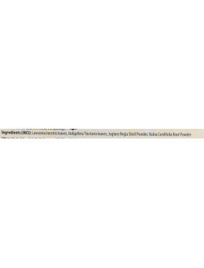 Sastāvs: Hennas lapu pulveris, Indigo lapu pulveris, Juglans Regia čaumalu pulveris, Rubia Cordifolia sakņu pulveris.