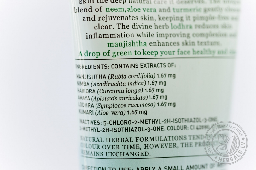 Aktīvas sastāvdaļas: Neem, Turmeric, Aloevera, Majistha, Lodhra, Kushtha.