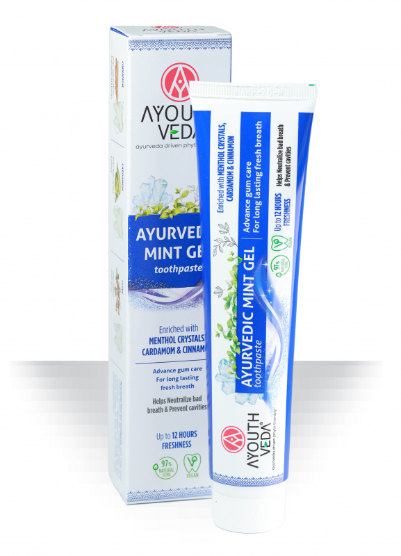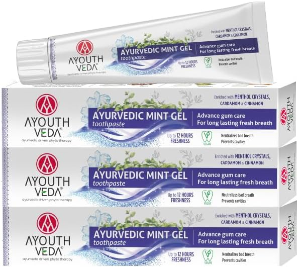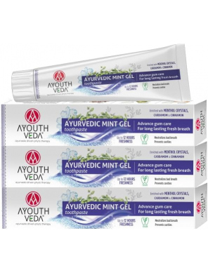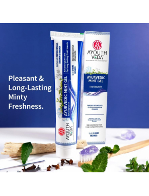 Ayouthveda Mint Gel Toothpaste ir dabīga ājurvēdiska gela zobu pasta ar atsvaidzinošu piparmētru garšu, kas paredzēta ikdienas zobu un smaganu kopšanai. Tās formula apvieno tradicionālās ājurvēdas sastāvdaļas un dabīgus augu ekstraktus, kas palīdz uzturēt mutes dobuma tīrību, aizsargāt zobus un nodrošināt ilgstošu svaigu elpu.
